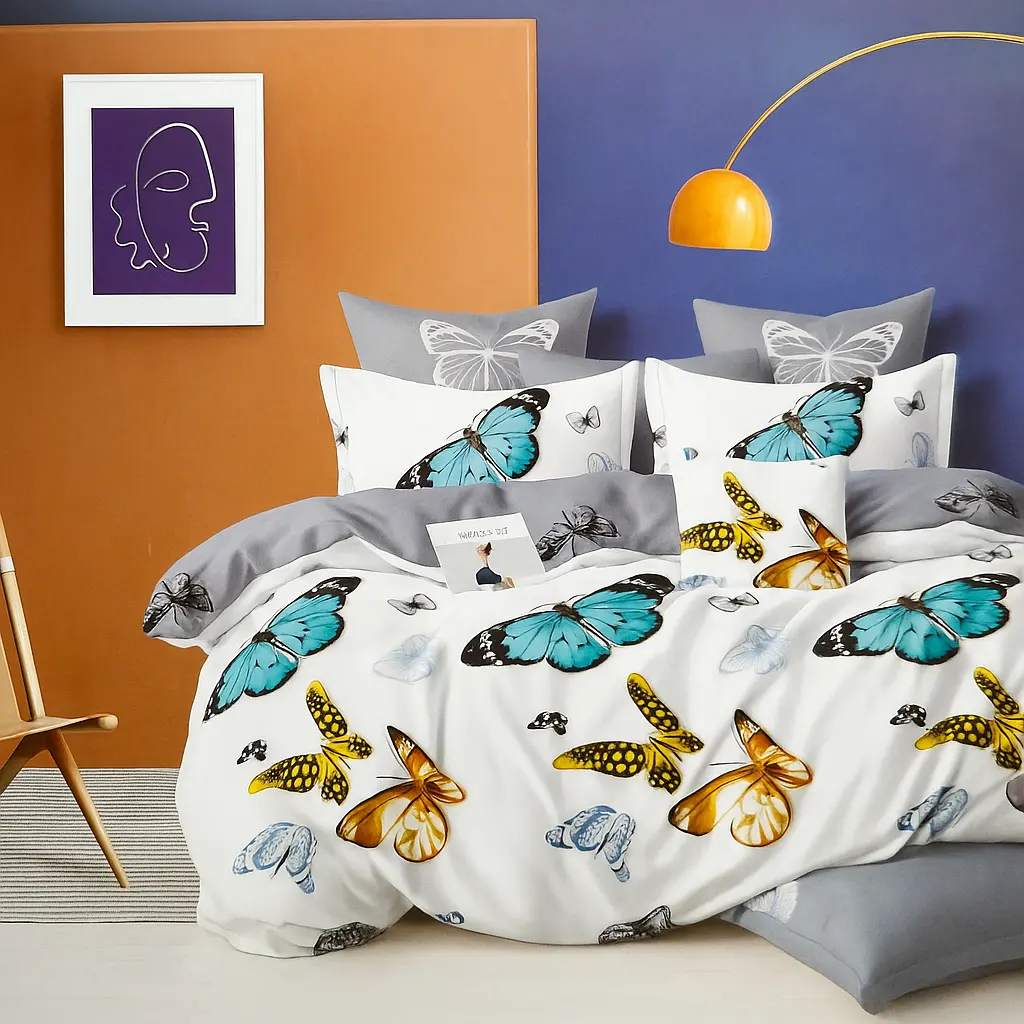 Prabangus baltos ir pilkos spalvos su drugeliais 100% medvilnės patalynės komplektas 200×220 dera tiek su klasikiniu, tiek su moderniu interjeru. Tai investicija į kokybišką miegą ir ilgaamžiškumą. Dėl savo dydžio jis puikiai tinka erdvioms dvigulėms lovoms, suteikdamas maksimalų komfortą ir jaukumą.