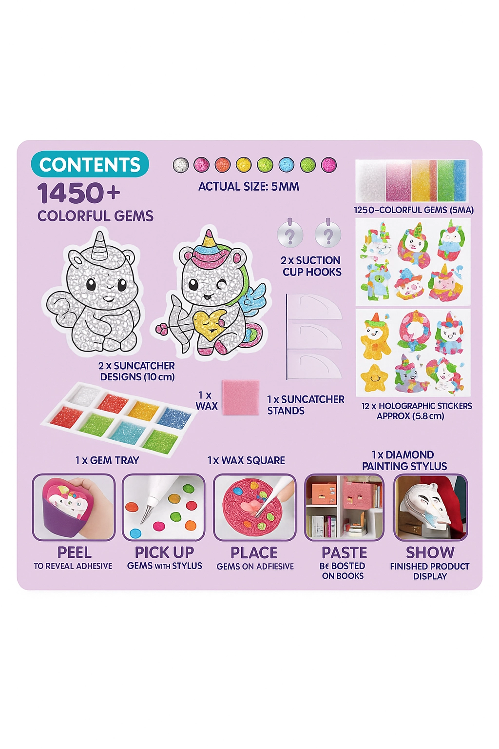 Deimantinė dėlionė su lipdukais vaikams rinkinyje rasite daugiau nei 1000 ryškių spalvotų brangakmenių, 12 holografinių lipdukų bei 2 dideles saulės gaudykles su stoveliais ir siurbtukais, kad jas būtų galima eksponuoti lange ar ant stalo. Vaikai dekoruoja elementus naudodami specialų pieštuką-stilių, kuris leidžia lengvai perkelti „deimantus“ ant lipnių paviršių – be netvarkos ir klijų!