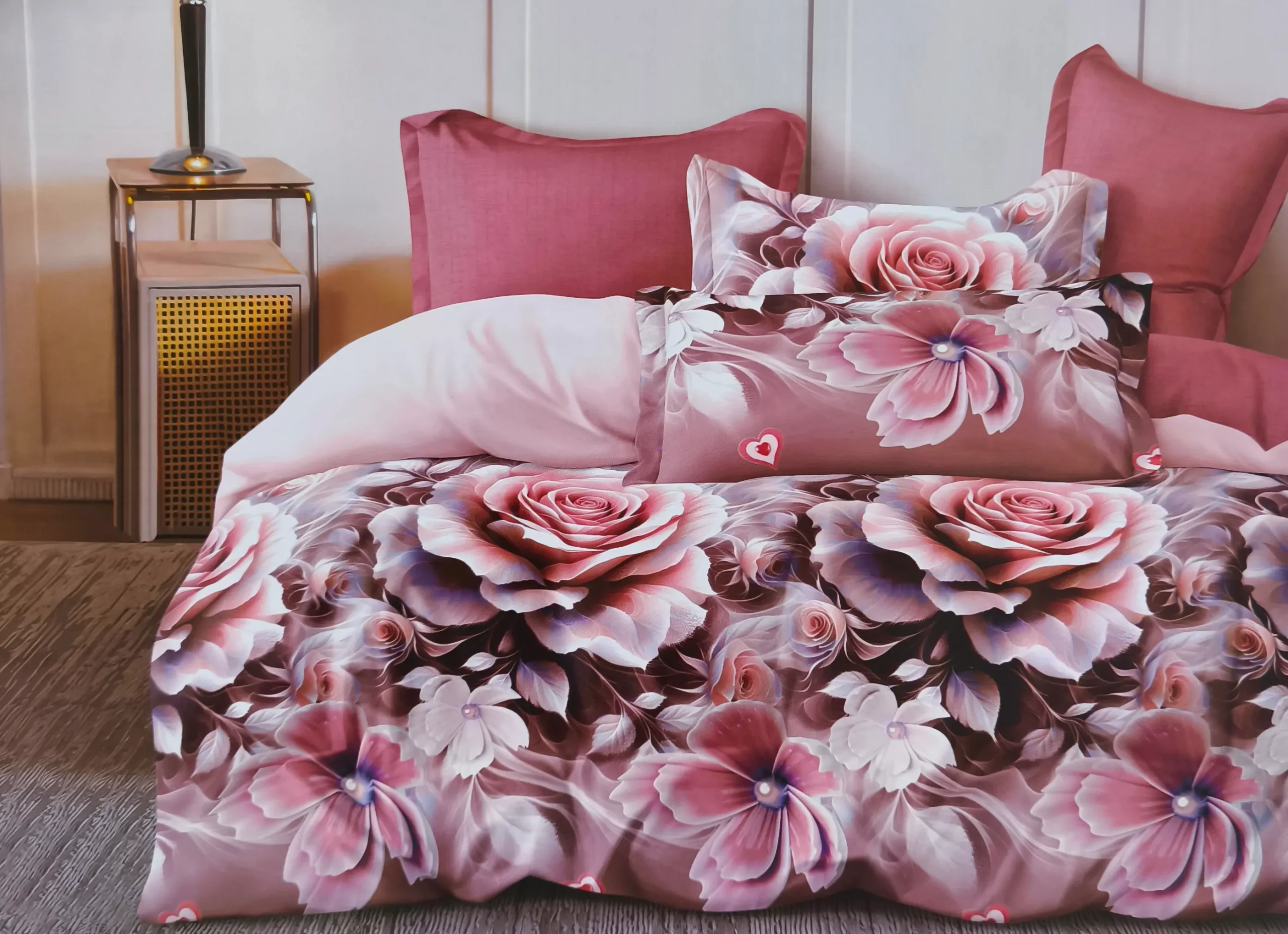 Dvigulės satino medvilnės patalynės komplektas 200×220 šviesios bordo spalvos su gėlėmis  – prabanga ir komfortas jūsų miegamajam.