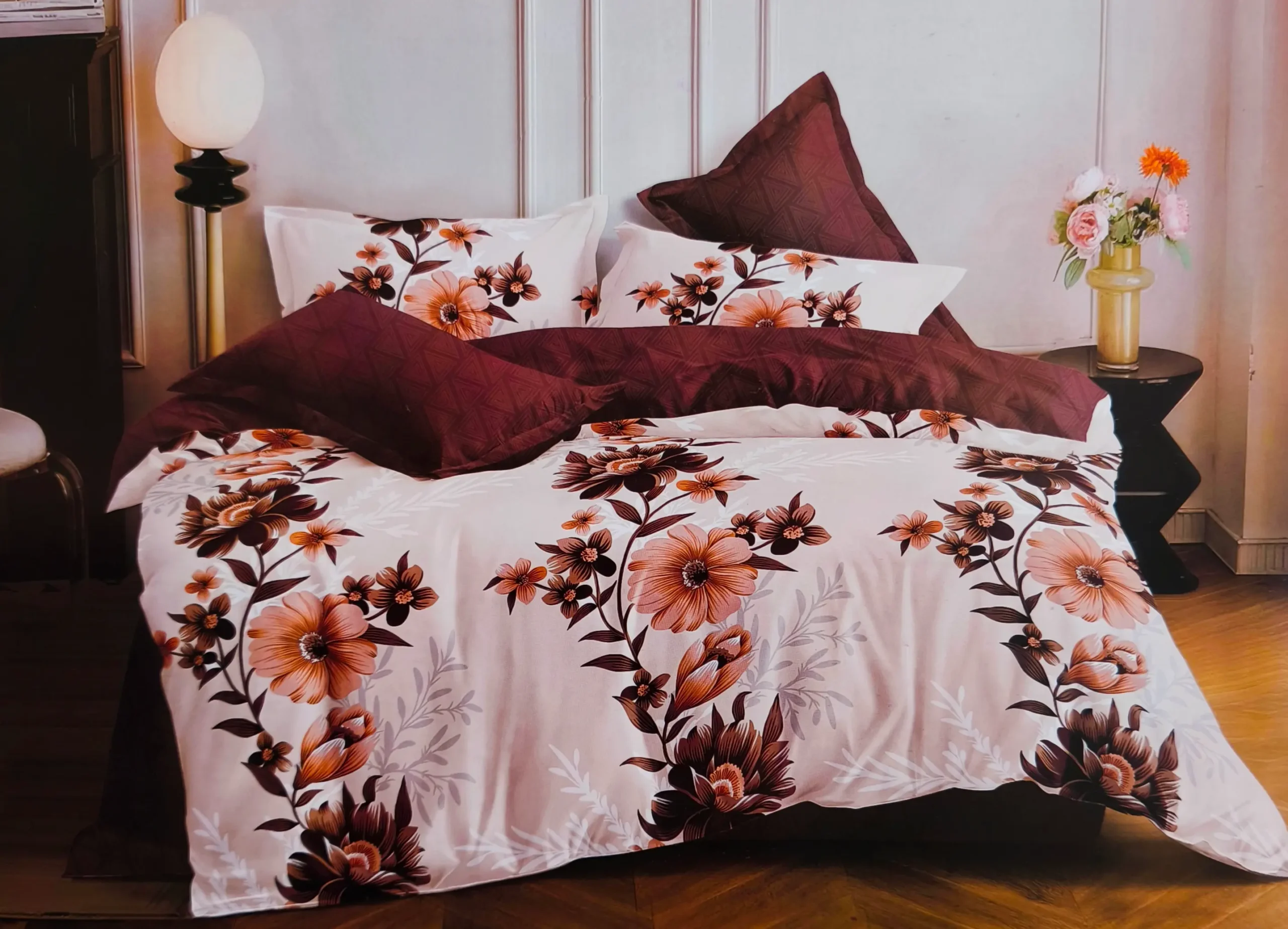 Patalynės komplektas 200×220 iš satino medvilnės bordo spalvos su gėlėmis – prabanga ir komfortas jūsų miegamajam.