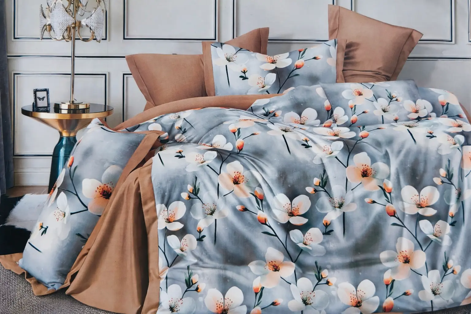 Patalynės komplektas 200×220 iš satino medvilnės rudos ir pilkos spalvos su gėlėmis – prabanga ir komfortas jūsų miegamajam.