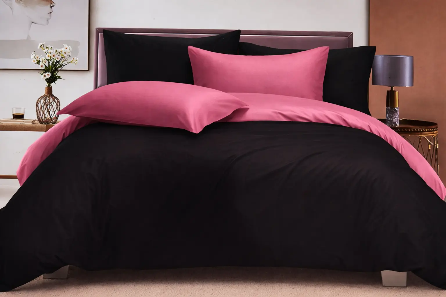 Patalynės komplektas 200×220 iš satino medvilnės juodos ir pelenų rožinės spalvos – prabanga ir komfortas jūsų miegamajam.