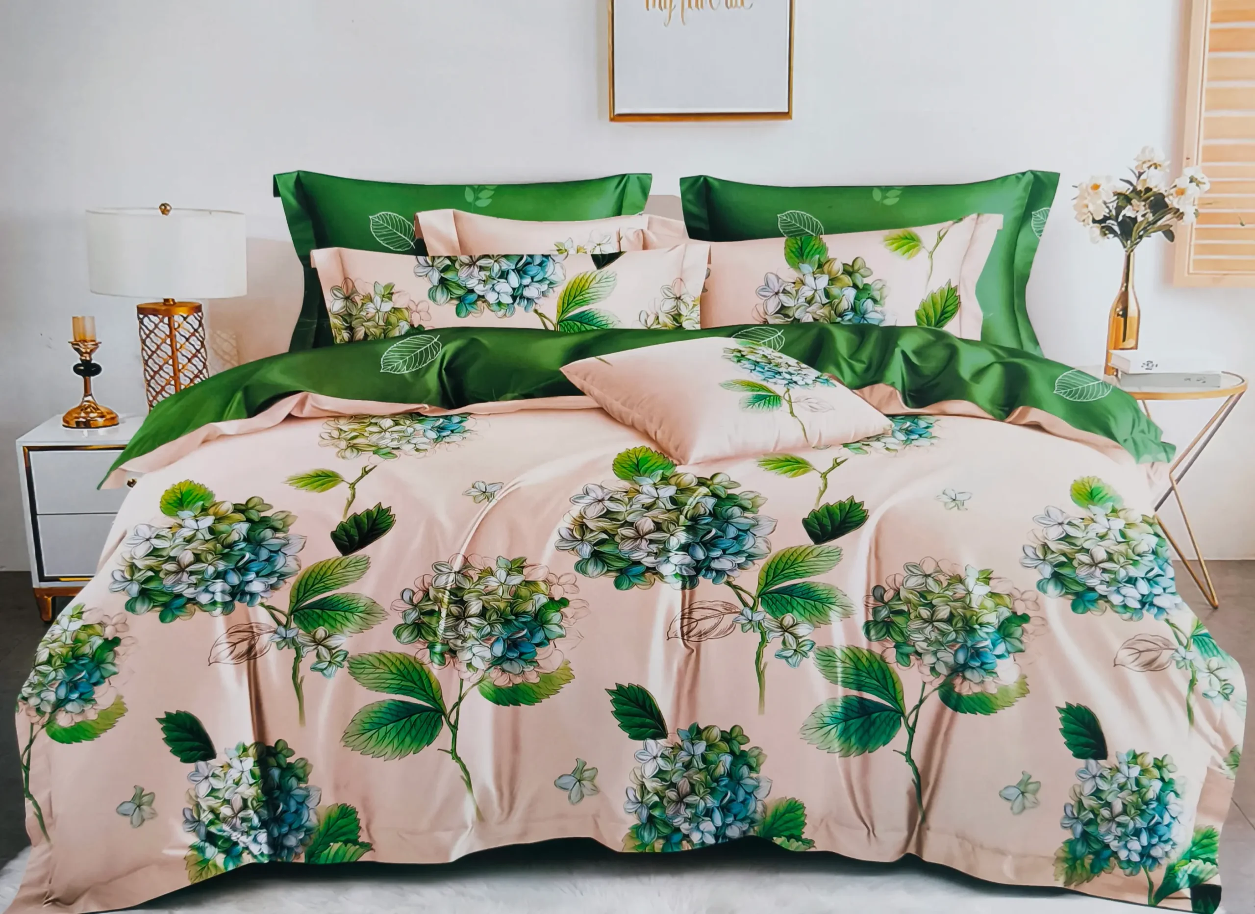 Dvigulės satino medvilnės patalynės komplektas 200×220 kreminis su žaliu raštu – prabanga ir komfortas jūsų miegamajam.