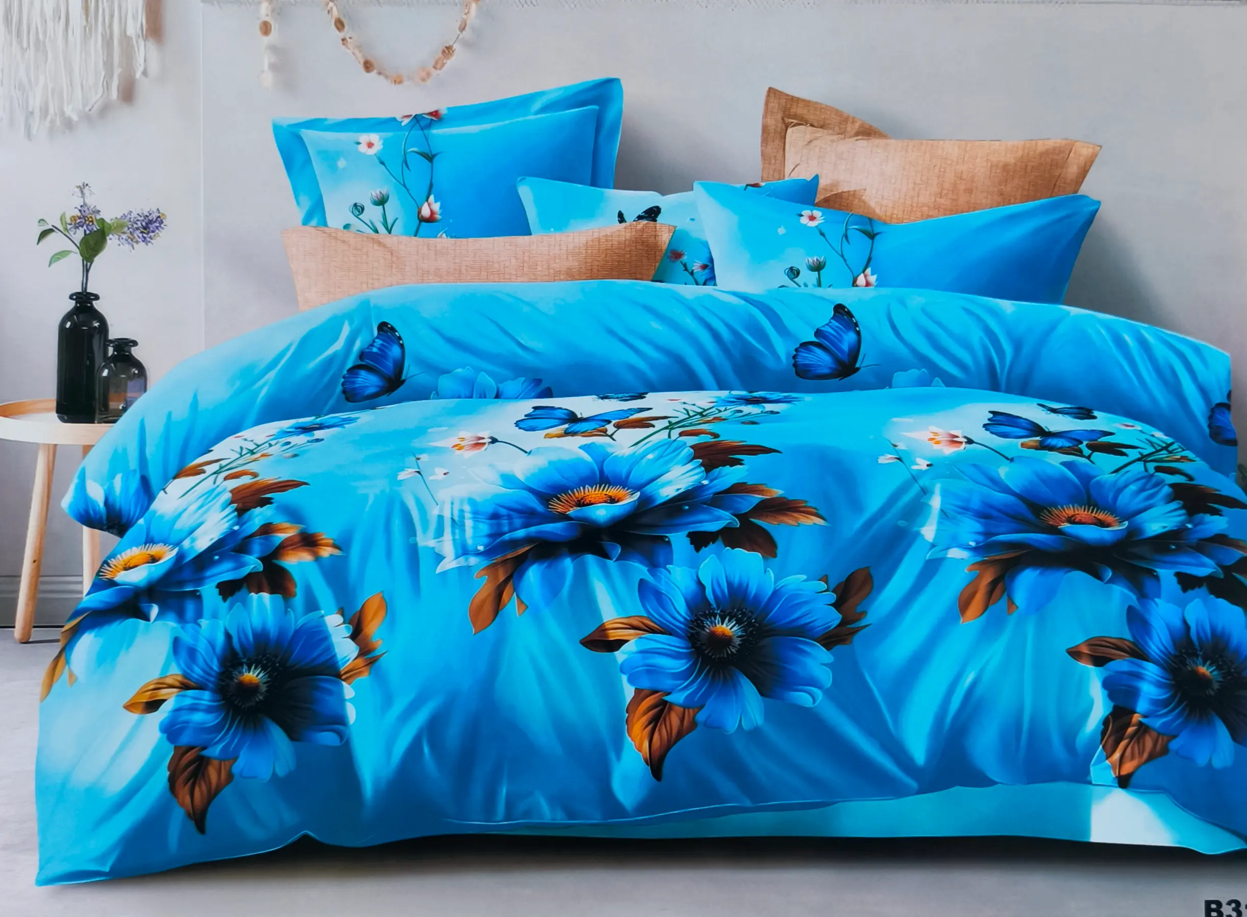 Dvigulės satino medvilnės patalynės komplektas 200×220 žydros spalvos su gėlių raštu – prabanga ir komfortas jūsų miegamajam.